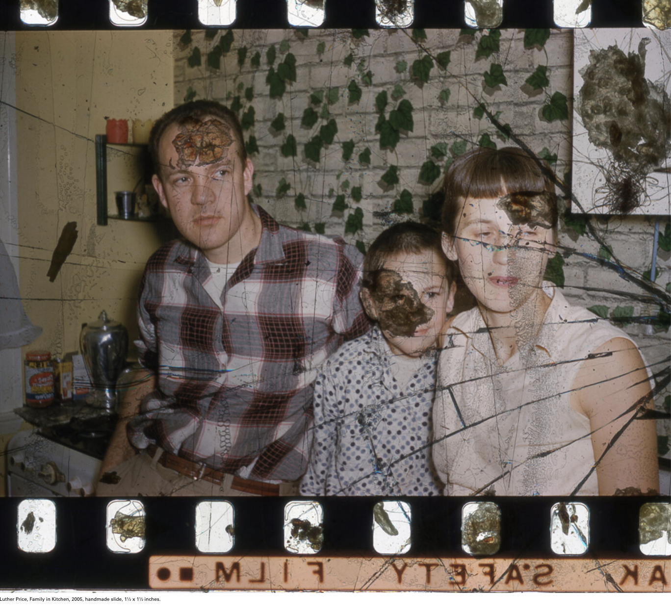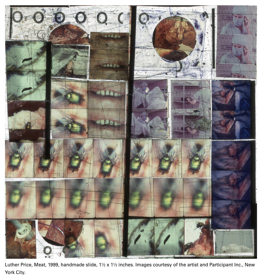 Found film, slides, “Warped, ripped and decayed, Luther Price’s slides and film seem transformed by the many unseen processes of the body. In his composition process, Price unites the synthetic material of found film with the environmental debris of minerals, dirt, insects and soil. Arranged side by side in a space that recalls the darkness of the cinema, these slide and film projections engulf the viewer, demanding such immediacy.”
